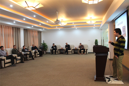 精誠儀表董事長沈遠航與技術部經理馬鵬飛在會客廳接待遠道而來的客人。馬鵬飛針對考察團特別關注的熱量表進行了詳細的介紹,并針對客人提出的問題做深入解答。